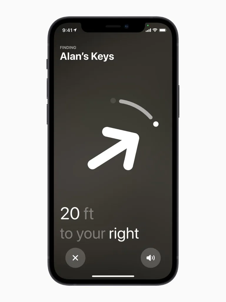 AirTagの目玉機能は「精密検出」です。iPhone 11で導入されたU1チップを活用し、タグが近くにあると視覚的にタグまでナビゲートしてくれます。UI自体も非常に美しく、画面上に不定形の円が渦巻いて矢印を形成し、心地よい音と触覚フィードバックが加わります。クールなアイデアですね。