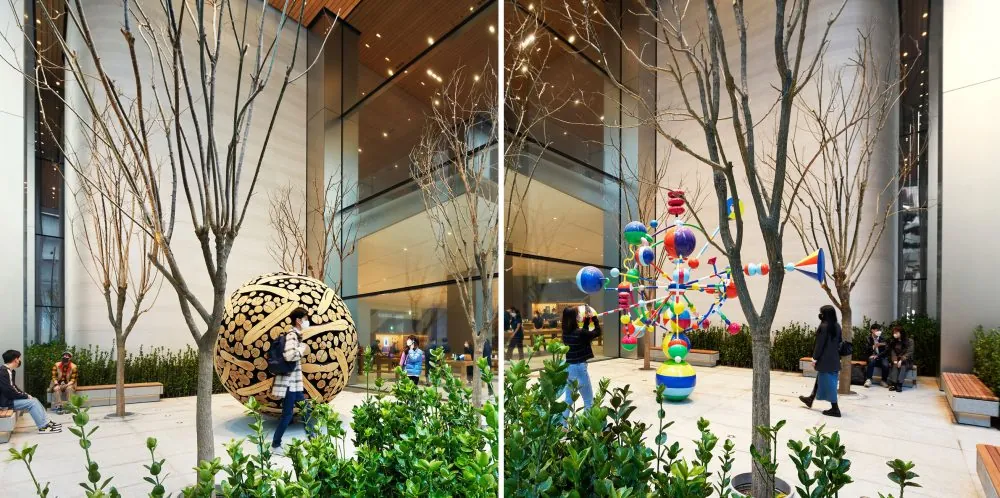 Appleが本日公開した公式写真のほとんどを見ると、テーブルや壁面ディスプレイのレイアウトやデザインはお馴染みのものばかりです。しかし、店舗の外には、地元で制作された彫刻というユニークな工夫がいくつか見られます。