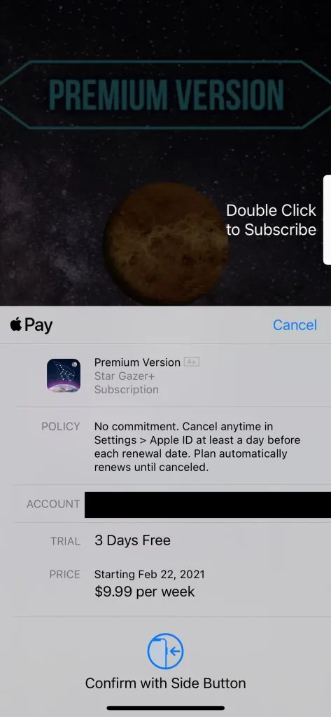 変更は些細なものですが、サブスクリプションの登録数に確実に影響を及ぼします。Appleはシート上のすべてのテキストを読みやすくし、顧客にとってより明確な表現となるよう言語を更新しました。シートへの最初の、そして最大の変更点の一つは、「App Store」のワードマークを「Pay」に置き換えたことです。これにより、顧客は何かを購入していることを明確に理解できます。